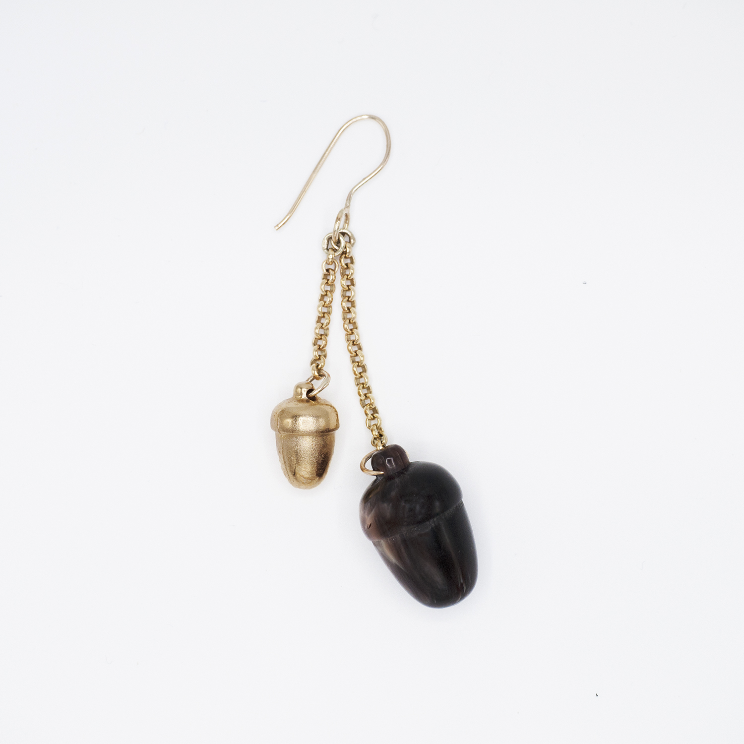 Designed to be worn singly or mixed and matched with other earrings in the collection, this earring features a brown, 1940s, vintage Italian cellulose acorn and its 9 ct solid recycled gold counterpart, hanging from Queen Midas’s signature ear wire.