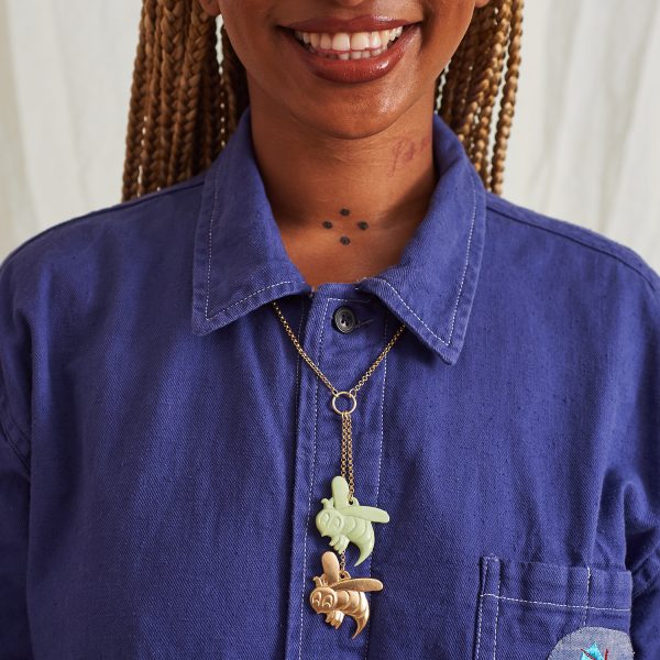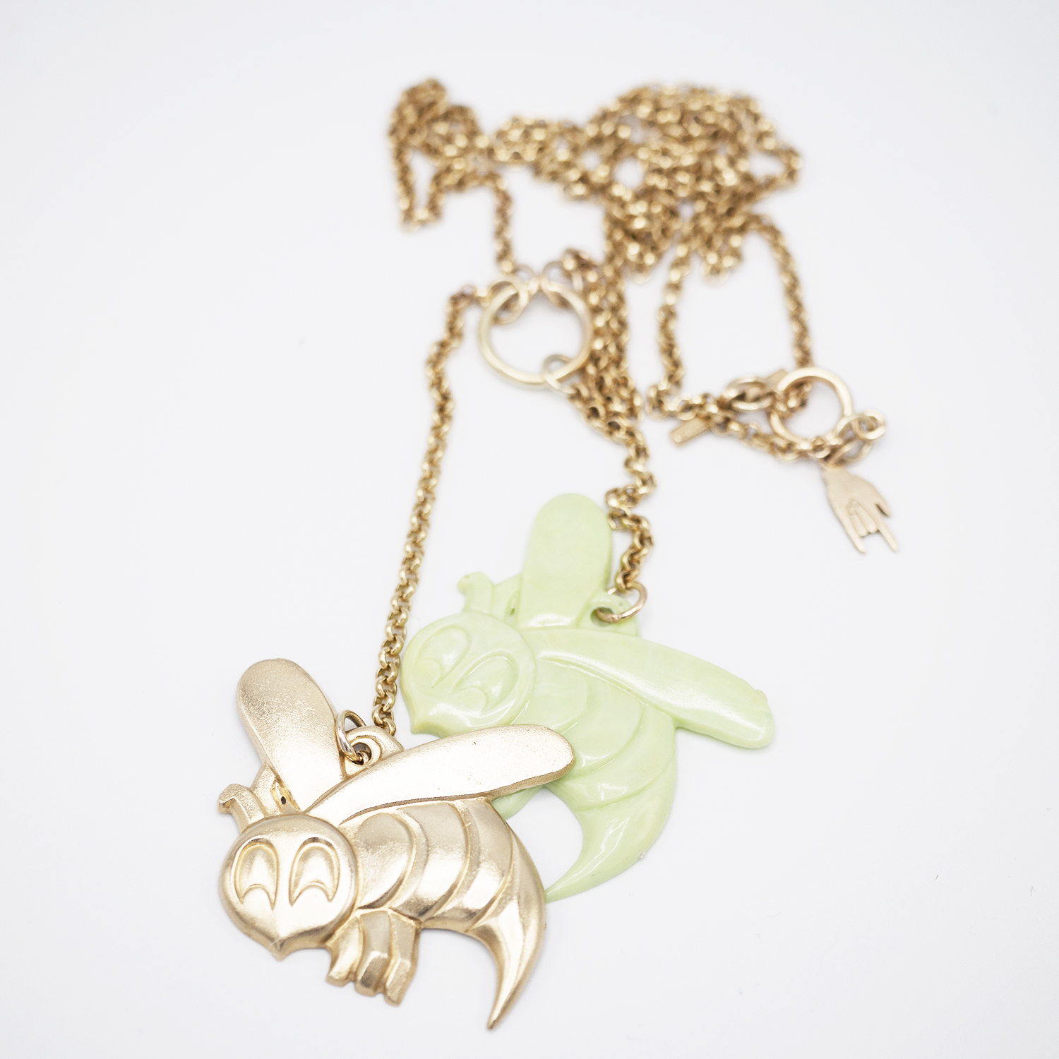 Green 1940s, vintage American, lucite ‘Crackerjack’ gumball machine bee and 9 ct, recycled yellow gold bee on 50 cm long, 9 ct yellow gold, 2.74 mm round belcher chain with hallmarked rock hand at the clasp. Toggle clasp. Please note, this is the total length of the chain. The drop including both charms is 38 cm. The bees measure 4 cm x 4 cm and come in a bespoke leather box.